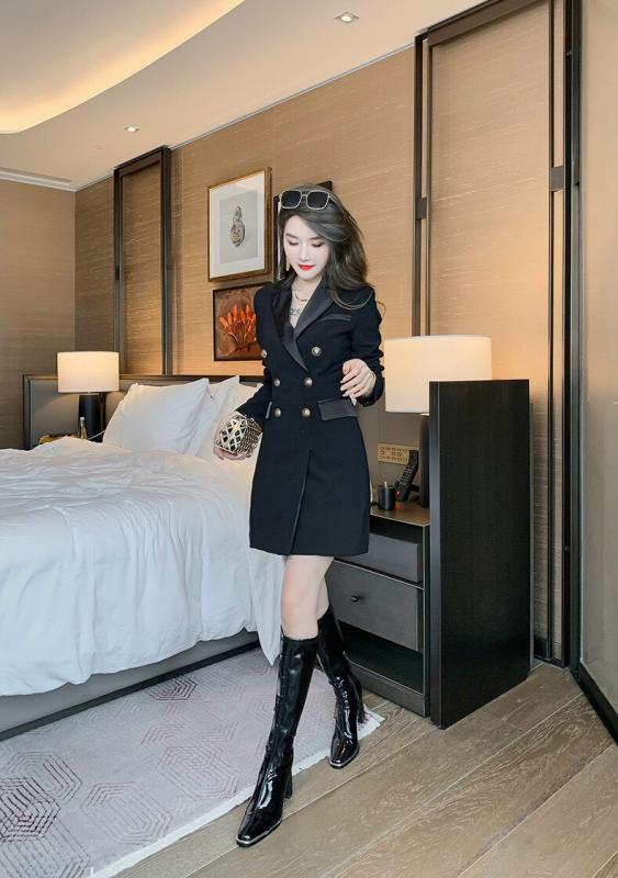 Kiểu dáng: đầm dáng ôm suông, cổ vest, tay dài, đính nút trước và cổ tay, dây kéo sau lưng