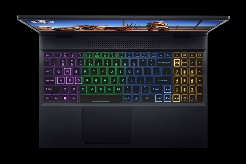 Acer Nitro AN515-58-79UJ trang bị bàn phím Fullsize với hành trình phím tối ưu, độ nảy, độ nhạy tốt. Đặc biệt, bàn phím còn được trang bị đèn nền RGB 4 vùng tùy chọn với các phím WASD, tăng thêm sự hứng khởi khi bạn đang ở trong cuộc chiến và giúp bạn dễ dàng gõ phím trong điều kiện thiếu ánh sáng, đêm tối. Bạn có thể tùy chỉnh hiệu ứng chuyển đổi màu sắc yêu thích thông qua phần mềm Nitro Senser cực tiện lợi.
